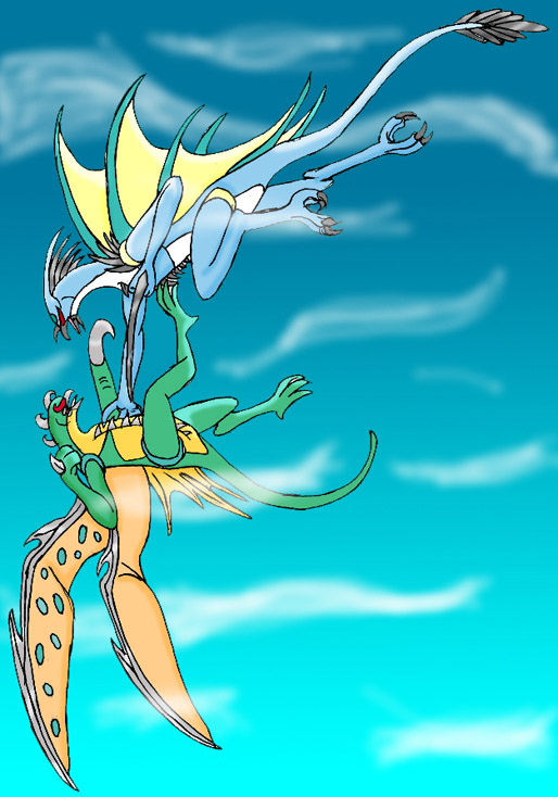 "Not if I break yours first!" retorted Galina. Gaiganny hit the ground, yet managed to swish her tail around and behind Galina's legs, sweeping the hen off her feet as well. Gaiganny rolled onto her stomach and with a quick push up is airborne. Galina would not let her get away with this and leaped onto the little green hen, hanging on to her neck and madly swinging her scythes at her. Dodging as best she could Gaiganny lifted herself and Galina into the air. Enraged Galina sank her silver beak into Gaiganny's neck. Blood splurted out as Gaiganny screamed, but responded to the gesture by stabbing her in the cheek with her hand spike. "Wretch!!" Yelled Galina. She brought her cranium down in a head bang that ended with her extending her crest and slashing Gaiganny down the cheek and neck. Gaiganny screamed in pain, losing control of her flight. The two began to spiral out of the sky exchanging blows and insults.